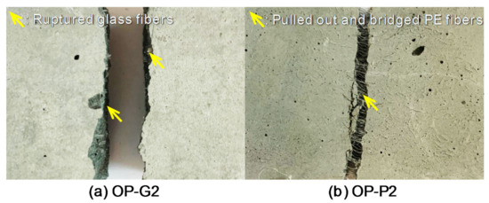 The tensile stress and strain curves are shown in Figure 8. A total of six dog-bone specimens per each variable were tested and among them, one or two specimens exhibited crack localizations near the neck (beyond the gauge length). These samples were not used to obtain the average values, so that at least four specimens were adopted for obtaining the average results. It is clear that adding PE fibers was more effective for enhancing the post-cracking tensile performance of the HPCCs than adding glass fibers. Moreover, beyond a volume content of 1%, a strain-hardening response occurred, leading to a higher load-carrying capacity even after the formation of initial cracks in the matrix. By increasing the volume fraction of the PE fibers from 1% to 2%, the tensile performance was further improved, as shown in Figure 8a. On the other hand, a strain-softening response was still observed for the HPCCs with 2% glass fibers by volume. The poorer tensile performance observed in the HPCCs with glass fibers was mainly caused by their insufficient tensile strength, leading to premature ruptures and limiting the effective stress-carrying capacity at crack planes. As shown in Figure 9a, no glass fibers that had pulled out from the matrix were observed at the localized crack surface. However, owing to the superior tensile strength and hydrophobic surface of the PE fibers [34,35], they could be pulled out from the matrix without any breakage, thus continuously absorbing energy with a moderate crack-bridging capability. This is verified in Figure 9b showing that numerous PE fibers effectively bridged the localized crack plane. PE fiber was thus considered to be a more suitable reinforcement for HPCCs than glass fiber.