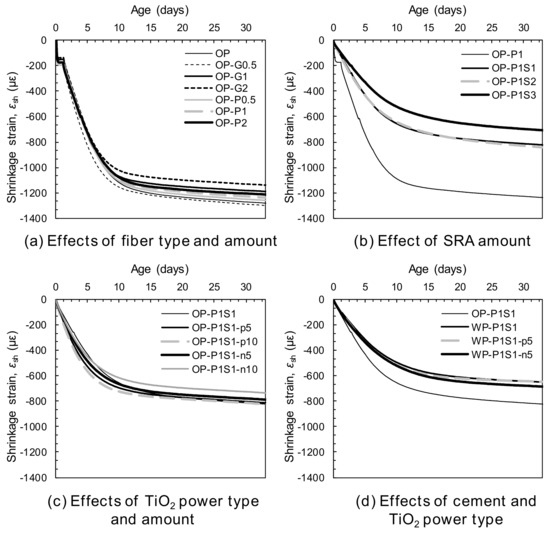 Shrinkage behaviors: (a) the effects of the fiber type and amount, (b) the effect of the SRA amount, (c) the effects of the TiO2 powder type and amount, and (d) the effects of the cement and the TiO2 powder type.