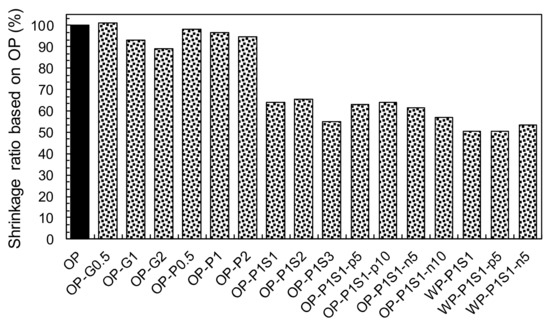 The shrinkage behaviors of HPCCs with and without SRA are shown in Figure 10b. It is clear that adding SRA was effective for achieving the volume stability of the cement mortar. Generally, the effectiveness was increased with the increasing content of added SRA, owing to the decreased surface tension of the pore solution [42,43]. The main autogenous shrinkage mechanism at the early ages in this study is the self-desiccation of pore water, leading to the formation of a meniscus and pore pressure through surface tension. Thus, the substantial decrease in the surface tension of the pore solution incurred by adding the SRA suppressed the steep increase in the early age shrinkage strains before 48 h. In order to verify this explanation, the surface tension of distilled water with and without SRA was measured. The surface tension of the pure distilled water was found to be 0.0753 N/m and it decreased to 0.0315 and 0.0309 N/m with the adding of the SRA to the distilled water as much as 4% and 10%, respectively, corresponding to the 1% and 3% by weight of the binder (S1 and S3). This was consistent with the findings of Bentz et al. [44]. Figure 10b indicates that the initial shrinkage strain that developed up to approximately 200 με in the OP-P1 sample was eliminated by including the SRA, regardless of its amount. Furthermore, the drying shrinkage was also decreased by the addition of the SRA. This was the opposite of that observed with distilled water: the distilled water containing SRA led to faster mass loss at early ages than that without the SRA [44]. The decreased drying shrinkage of the cement mortar with the addition of the SRA can be explained by non-uniform drying throughout its thickness. Bentz et al. [44] reported that the initial drying at the exposed surface concentrated the SRA in the remaining pore solution, limiting the drawing of water from the pore solution with a higher surface tension beneath it. This reduced the mass loss rate of the cement mortar containing SRA. Owing to the decreased autogenous and drying shrinkage of the HPCCs, higher SRA contents resulted in greater reductions in the total shrinkage after 30 days (Figure 11). For example, the sample containing 3% SRA (OP-P1S3) produced a 30-d shrinkage strain of 698 με, which was only 57% of that of the OP-P1 sample without the SRA. Furthermore, by adding only a small amount of SRA, i.e., 1%, a significant decrease in the shrinkage strain was observed; for instance, the OP-P1S1 sample had a 34% reduction in shrinkage strain compared to that of the OP-P1.