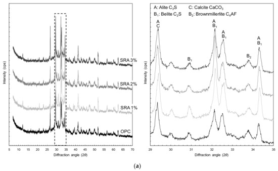 The XRD peak pattern was not affected by the existence and amount of SRA in Figure 12a, indicating that it did not influence the type of hydrates. As was reported in a previous study [38] that a delayed setting of UHPC was observed with the addition of the SRA, the XRD peaks of cement clinker, e.g., alite, belite and brownmillerite, were obviously obtained with the addition of SRA.