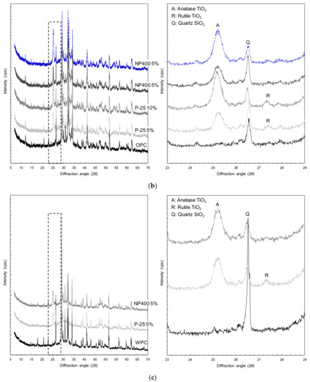 The influences of the white Portland cement and the TiO2 powers on the XRD results are illustrated in Figure 12c. By replacing the OPC with white Portland cement, the XRD peaks of calcite and quartz were much higher than those for the OPC sample due to the different cement types. Similar to the OPC samples, rutile and anatase peaks were observed in the samples containing both the white Portland cement and the TiO2 powders (Figure 12c), indicating that the former did not influence the state of the TiO2 powders during the hydration process.
