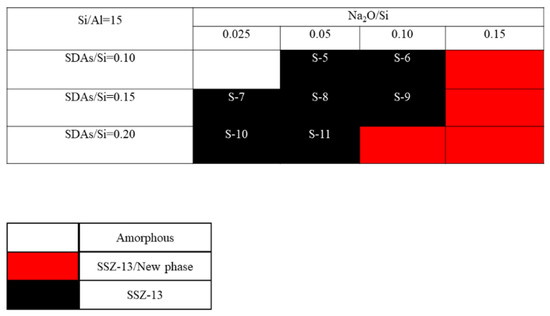 The optimal synthesis condition can be obtained using the designed experimental matrix that contained variable parameters of the compositions of SDAs and NaOH. Three Si/Al ratios (8, 15, 25) were selected as the representative and general experimental variables, as seen in Table 1. From the viewpoint of the framework for the generation of aluminosilicates, some Al3+ substitute a fraction of the lattice Si4+, depending on the content of the SDAs. Besides that, the NaOH solution provides the extra lattice cations and extra -OH, which compensate the anionic charges of the SSZ-13 materials obtained to synthesize the gel. Thus, the crystallization of SSZ-13 should generate a particular range of molar ratios in the synthesized gel.