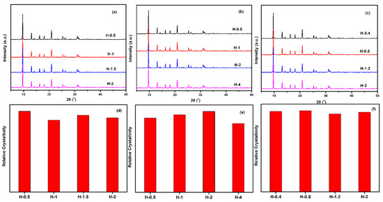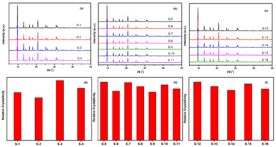 XRD pattern (top) and relative crystallinity (bottom) of SSZ-13 with different Si/Al ratios. (a,d) for Si/Al = 8 SSZ-13 materials; (b,e) for Si/Al = 15 SSZ-13 materials; (c,f) for Si/Al = 25 SSZ-13 materials. S-1, Sample 1.