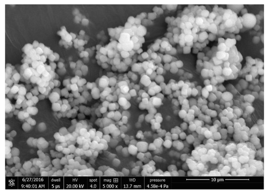 To further confirm that the above optimal condition was a universal method, SSZ-13s with different Si/Al ratios were also synthesized using ground seed under the optimized synthesis formula in Section 2.1. As shown in Figure 11 and Figure 12, the different sizes and uniform size distribution of the as-prepared SSZ-13s with Si/Al ratios equal to eight and 15 could also be obtained, verifying that using ground seed was a practical solution to deal with the grain size of SSZ-13 materials.