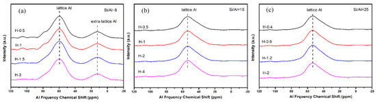 27Al NMR results of SSZ-13 with different sizes at different Si/Al ratios. (a) Si/Al = 8; (b) Si/Al = 15; (c) Si/Al = 25.