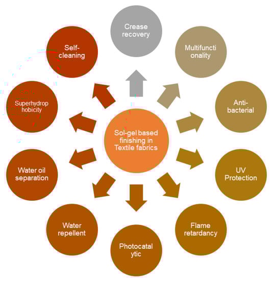 Textile wet processing consists of three important processes, namely pretreatment, coloration (dyeing or printing) and finishing [1,2]. Pretreatment (i.e. scouring, bleaching) is done first to prepare the textiles for the subsequent process called coloration [3,4]. After coloration, the textiles are subjected to the finishing process according to the end-use or consumer requirements [1,2,5,6]. As mentioned, the finishing process is the last chance to provide added value [7]. The finishing process provides special functional properties to the textiles such as flame-retardancy, water-repellency, water-proof, antimicrobial, soil/stain resistance, etc. [8]. Textile finishing can be classified according to different factors based on durability (durable or semi-durable), chemical (wet processing), mechanical (dry or physical treatments such as brushing, shearing, raising), aesthetic (modify the hand/ drape) and functional finishes. Generally, chemical finishing involves the addition of different chemicals based on the intended textile end-use [7]. Among the different finishing techniques, chemical finishing has been widely studied due to the current trends together with the customer requirements for high-tech or high-performance applications [9,10,11,12]. In the past two decades, sol-gel- assisted textile finishing has played a vital role in the development of novel applications to improve the basic properties of textiles. Generally, sol-gel-based textile finishing has more advantages to overcome the shortcomings of conventional finishing techniques [13,14,15,16,17]. The main advantages are eco-friendliness, less chemical utilization, low-temperature treatment, low toxicity to human health, protection of the inherent properties of textile materials, and the possibility to adjust the thickness of the coating and long-lasting properties of finished fabrics. Some types of sol-gel systems also have bacteriostatic or antibacterial effects [16,17,18,19,20,21,22]. These systems are anatase-modified photoactive TiO2 coatings and sol-gel coatings with colloidal metals or metal compounds embedded in them, such as silver, silver salt, copper compound, zinc or quaternary ammonium salt [18], so sol-gel technology can be applied to textiles to develop various functional finishes with antibacterial [23,24,25,26,27,28,29,30,31,32], water repellent [33,34,35,36,37,38], superhydrophobic [39,40,41,42,43,44], oil/water separations [45,46,47,48,49,50,51,52,53], flame-retardant [54,55,56,57,58,59,60,61,62] multi-functional [63,64,65,66,67,68], ultraviolet (UV) protection [69,70], self-cleaning as well as soil-repellency [18,71,72], photocatalytic [73,74], wear & abrasion resistance properties [75]. The main aim of this review paper is to describe the history, synthesis, application and progress of sol-gel finishing in the textile industry. The various applications of sol-gel techniques in textile finishing are summarized in Figure 1.