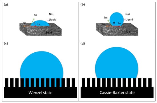 (a) Droplet on the flat surface with a contact angle lower than 90°; (b) higher than 90°; (c) Wenzel model; (d) Cassie-Baxter model (Reproduced from [113], with kind permission of Elsevier).