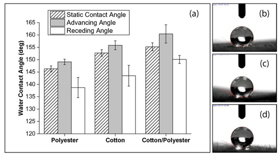 (a) Water contact angle of finished fabric; (b) droplet on polyester; (c) cotton; (d) blend of polyester cotton fabric (Reproduced from [40], with kind permission of Elsevier).