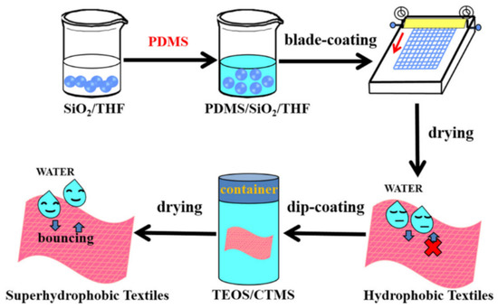 Xue et al. [42] coated polyester fabric with polydimethylsiloxane (PDMS) and then worked it up by blade coating with an alcohol solution containing tetraethyl orthosilicate (TEOS) as well as cetyltrimethoxysilane (CTMS). The schematic process is shown in Figure 6. The hydrophobicity of the fabric coated with PDMS-silica nanoparticles showed WCAs above 90° and the superhydrophobicity of TEOS and HDTMS post-treated fabrics provided a WCA of 162.5° and sliding angle (SA) of 5.4° (Figure 7). The treated fabric was resistant to hydrostatic pressures up to 38.6 kPa, and as the number of coatings increased, the sliding angle increased slightly. Their contact angle and water resistance did not change significantly after alkali and acid treatment or UV irradiation at different pH values. However, the bonding force between the coating and the fabric was insufficient and the water pressure resistance of the fabric was reduced to 10 kPa after a 10-cycle abrasion test.