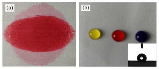 (a) Colored water droplet on pristine PET fabric; (b) PDMS/SiO2-PET fabric after four times blade coating (Reproduced from [42], with kind permission of Elsevier).