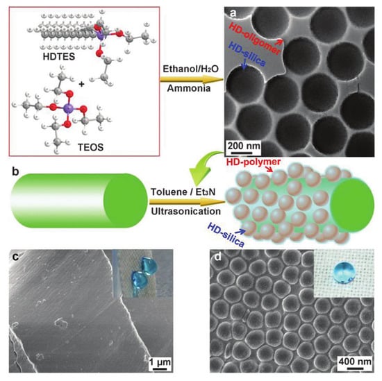 Zhang et al. [41] prepared a durable and robust superhydrophobic wool fabric by using fluoro-compound free organosilanes. The schematic process is shown in Figure 8. The hydrophobic wool fabric has been modified into superhydrophobic (Figure 8c) by the usage of nanocomposite composed of an oligomer of hexadecyltriethoxylsilane (HDTES) (HD-oligomer) and HDTES modified silica nanoparticles (HD-silica) that was prepared in advance via a modified Stöber method. HD-silica/HD-oligomer nanocomposites were applied on the wool fabric by a simple dip-coating method achieved using toluene as solvent and triethylamine as a catalyst, and ultrasonic treatment was carried out to prepare a wool fabric having excellent abrasion resistance, environmental stability and superhydrophobicity. The prepared samples were proved to have excellent mechanical resistance after being scratched by a scalpel. After 10 washes, the superhydrophobic property of the finished fabrics remained good.