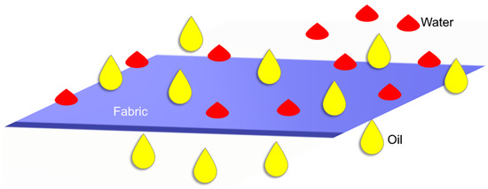 Onar and Mete [115] studied a two-step method to prepare water repellent finishes on cotton fabric with ZnO, Al2O3, TiO2 and ZrO2 nanoparticles. The cotton fabric surface was first roughened with ZnO, Al2O3, TiO2 and ZrO2 nanoparticles, and then modified hydrophobically with HDMS. The results show that the cotton fabric treated with Al2O3 nanoparticles and HDMS has superhydrophobic properties, and after washing, the fabric can maintain its hydrophobicity. Colleoni et al. [116] treated cotton and polyester fabrics with tetraethoxysilane (OTES) and melamine-based crosslinkers (N,N,N′,N′,N″,N″-hexakis(methoxymethyl)-1,3,5-triazine-2,4,6-triamine (MF)). Cotton fabrics and polyester fabrics were found to have good hydrophobicity with contact angles of 130° and 150°, respectively. Teli et al. [43] synthesized SiO2 nanoparticles by a simple sol-gel technique and they were applied to nylon knitwear by double-dip and double nip coating with a wet pickup of 80%. After the impregnation, the treated fabric was dried and cured. The modified nylon knit fabric had superhydrophobic properties with a WCA of 151°. The fabric also exhibited excellent UV protection with an ultraviolet protection factor (UPF) of 279.68 (i.e., UPF 50+). After 10 wash cycles, it still had hydrophobic and UV protection properties. De et al. [117] applied nanogels composed of 3-glycidoxypropyltrimethoxysilane (GPTMS) and a fluorine-containing alkyl functional water-based oligosiloxane (FAS, Dynasylan F8815) on silk fabrics by a sol-gel method using an acid catalyst. After finishing, the fabric was tested for 8500 abrasion cycles. The results confirm the oleophobicity (close to 123° for the 4th oil contact angle) and high hydrophobicity (WCA 148°). After analyzing the oil resistance and the water repellency of fabric, it was confirmed that the fabric was still hydrophobic (CA of 130°) and oleophobicity (CA of 100°) after 15 washing cycles. Vasiljevic et al. [118] prepared highly oleophobic and superhydrophobic cotton fabrics by a three-step sol-gel method. The first step was to prepare a cotton fabric treated with SiO2 nanoparticles which have an average particle diameter (50 ± 15 nm, 230 ± 20 nm and 780 ± 30 nm) by the Stöber method based on a sol-gel process; the second step is to grow the silicone layer in situ in the alkaline TEOS solution.; the third step was filling with a fluorine-containing alkyl functional water-based oligosiloxane (FAS, Dynasylan F8815). The fabric presented a low slip angle (2°), high oleophobicity (grade 6 oil, contact angle close to 150°) and superhydrophobicity over 10 washes. Zhou’s group [119] fabricated a durable superhydrophobic fabric coating via dip-coating fluoroalkyl silane-modified SiO2 nanoparticles, PDMS and a fluoroalkyl silane mixture. The coated fabric exhibited excellent durability against strong acid, strong alkali, and the coating still showed great superhydrophobicity with WCA above 160° after 500 washing cycles and severe abrasion cycles, respectively. Cao et al. [120] prepared the fluorine-free superhydrophobic fabric by simple dip-coating method. The PDMS coated fabric showed a WCA of 160° and in addition it provided the self-cleaning properties and oil/water separation abilities.