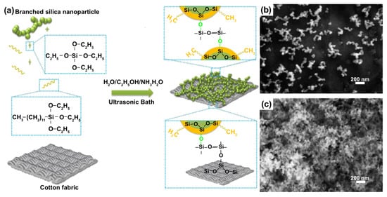 (a) One-pot fabrication process of superhydrophobic cotton fabric; (b) branched silica nanoparticles and (c) porous nanostructure of branched silica nanoparticles (Reproduced from [52], with kind permission of Springer).