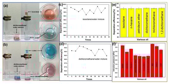 (a) Performance of treated fabrics on light oil/water separation; (b) heavy oil/water separation; (c) 50 times recyclable separation efficiency of isooctane/water mixture; (d) 50 times recyclable separation efficiency of dichloromethane/water mixture; (e) separation efficiency of the fabric for various oil/water mixtures and (f) intrusion pressure of the fabric (Reproduced from [135], with kind permission of Elsevier).