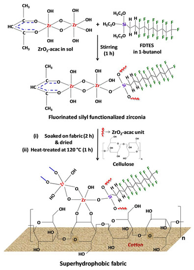 Schematic representation of fluorinated silyl functionalized zirconia sol-gel coated fabric (Reproduced from [137], under a Creative Commons Attribution 4.0 International License).