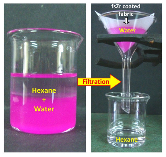 Xu et al [136] produced a superhydrophobic and superoleophilic glass-fiber fabric by a simple sol-gel process using triethoxymethylsilane (MTES) as precursor. The prepared fabric can effectively separate micron-sized surfactant-stabilized water-in-oil emulsions solely driven by gravity. Most importantly, this fabric can withstand acid/alkaline and high-temperature environments. Besides, the separation efficiency of as-prepared glass-fiber fabric remains high even after being used 20 times. Hence, this simple, efficient, and low-cost preparation of fabric with special wettability shows potential in industrial applications. Das et al. [137] developed a zirconia-based superhydrophobic and superoleophilic coating on cotton fabric (Figure 14). The resultant fabrics showed excellent water repelling and superoleophilic properties with chemical stability. In this case the authors performed the water separation experiments on coated “filter cloth” as shown in Figure 15. When a vigorously stirred mixture of hexane-water was poured onto the treated cotton fabric, hexane immediately spread and freely permeated through the fabric at atmospheric pressure and, rapidly accumulated into the bottom of the beaker. It can be clearly seen in Figure 15 that there was no water in the separated hexane. On the other hand, the water (red colored by Rhodamine B for visibility) still remained on the textile surface.