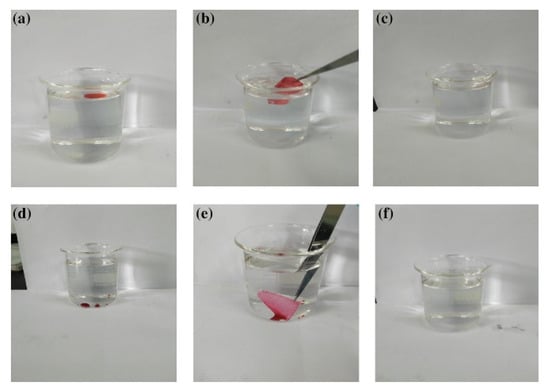 (a–c) Fluorinated polymeric sol-gel incorporated fabric on hexane removal and (d–f) chloroform with the help of water (Reproduced from [138], with kind permission of Wiley).