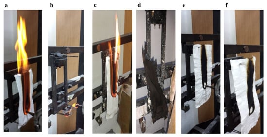 (a) Flammability test of untreated cotton fabric after 20 s; (b) after 45 s; (c) CPTS treated cotton after 20 s; (d) after 67 s; (e) MCPTS treated cotton after 20 s and (f) PCPTS treated cotton after 20 s (Reproduced from [147], with kind permission of Springer).