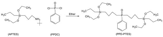 Recent research shows that ionic liquids together with a silica precursor confer good resistance to a direct flame. Figure 19b,d shows the burning of untreated and treated cotton with CPTS for 45 and 67 s, even after removing the flame, respectively. For untreated cotton, the final residue after the test was 1% (in weight) and the one treated with CPTS was 15%. In either way, fabrics made from cotton with [MCPTS]PF6 or [PCPTS]PF6 do not burn. Figure 19e,f show that treated cotton does not flame during and after the removal of the flame. A maximal final residue of 93% was obtained after the application of a flame for 20 s was recorded. A comparative so these these results suggests that ionic liquids can be considered as extremely good flame-retardants for cotton textile materials. Zhang et al. [148] used TEOS and boric acid to improve the flame retardancy of silk fabrics by a sol-gel process along with 1,2,3,4-butanetetracarboxylic acid (BTCA) as crosslinker to improve the durability of fabric flame retardancy. The results showed that when the intrinsic flame-retardant silk fabric containing P, N or S was treated with BTCA solution and also treated with boric acid containing nanosol as flame retardant the LOI value increased from 25.3% to 32.3%. In addition, the flame retardancy of silk fabrics was resistant to 30 washes. The peak heat release rate (PHRR) of the treated silk fabric was reduced drastically. The total exotherm, mass loss and reduced smoke density were reduced compared to the untreated fabric, which indicates low flammability. In addition, there is no change in the tensile properties of the treated samples, but the hand of the sol-treated samples was significantly reduced. Nylon 6 with thermal oxidative stability was prepared by utilizing 9,10-dihydro-9-oxa-10 phosphaphenanthrene-10-oxide-modified vinyl trialkoxysilane (DOPO-VTS) and tetraethoxysilane by Sehic et al. [149]. Thermal analysis of coated samples reveals that the plating affects the decomposition of PA6 at minimal temperatures, in creating a positive char formation and minimizing overall heat release. Tests conducted through vertical flame spread reveal that carbon carbide fully avoids the dripping of the polymer melt at maximal precursor concentrations in the coating. Deh et al. [150] studied the halogen and formaldehyde free flame retardancy of cotton fabrics treated with phosphoric acid and urea phosphoric acid. They studied the synergistic effect of silicon and nitrogen with TEOS as a precursor. They found that cotton fabrics treated with phosphorylation and sol-gel processes had higher limiting oxygen index values (> 25%., i.e. less than 25 % can be easily flammable) and were resistant to 10 washes. Si, N and P on cotton fabrics help to form charcoal acting as a thermal barrier and reduce the number of by-products that do not promote the dehydration process. Liu et al. [151] developed the organic and inorganic hybrid coating on cotton by using APTES and phenylphosphonic dichloride (PPDC) which produce di-(triethoxysilylpropyl) phenylphosphamide (PPD-PTES) as a flame-retardant material. The synthesis route is shown in Figure 20. PPD-PTES was used to coat the cotton fabric at 5, 10, 20 and 30 min, later it was dried 4 h at 100 °C to stabilize the PPD-PTES mixture on the cotton fabrics. Vertical burning tests were used to measure the flame-retardancy of the treated cotton fabric. The cotton fabric treated with the PPD-PTES blend coating self-extinguishes immediately after removal of the ignition source, while the uncoated cotton fabric is burned off, as shown in Figure 21a. The char area on the fabric treated for 30 min was the smallest (Figure 21b) among the other times. From the scanning electron microscope (SEM) images shown in Figure 21c, it was visible that, untreated fabric contained a loose and cracked residue compared to the treated cotton samples after burning tests. Energy-dispersive X-ray spectroscopy (EDX) analysis confirms the more uniform dispersion of phosphorus than silicone.