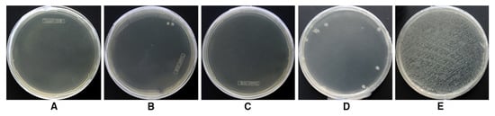 (A) Zone of inhibition (E. coli) on the 3% Zinc acetate on the number of CFU after 24 h. unwashed sample; (B) after 1 washing cycle; (C) 5 washing; (D) 10 washing cycles and (E) 20 washing cycles (Reproduced from [158], with kind permission of Elsevier).