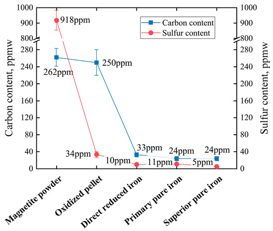 The reduction of oxidized pellets by hydrogen can effectively decrease sulfur and carbon in iron ore. Figure 2 shows the changes in carbon and sulfur content in each step, in which “ppmw” means parts per million by weight. As can be seen from Figure 2, the sulfur content reduces during the roasting of pellets.