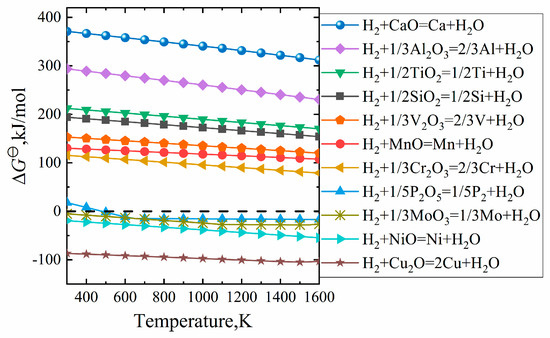 Because of the reduction characteristics of hydrogen, the reduction process is selective, that is, the valuable element Fe can be extracted from the iron ore, while most of the valueless gangue minerals cannot be reduced into metal. The selective reduction of oxides by H2 can be explained by Figure 3, which shows the standard Gibbs free energy change for the reactions of hydrogen with various oxides that may exist in ores [12]. At the temperature where direct reduction occurs, i.e., 1073–1273 K, the general oxides such as manganese oxide, silicon oxide and alumina cannot be reduced into iron, while only phosphorus oxide, molybdenum oxide, nickel oxide and copper oxide can be completely reduced. The removal of phosphorus can be accomplished in subsequent steps, while the reduced copper, nickel and molybdenum are difficult to eliminate. Fortunately, the content of these oxides is relatively low in common iron ores. The blast furnace ironmaking uses coke as a reducing agent, and the temperature of blast furnace ironmaking is about 1773 K. This leads to the partial reduction of manganese oxide, silicon oxide, etc. into the molten iron, which imposes a burden on the refining process. This is why the hot metal of a blast furnace is not as pure as DRI.