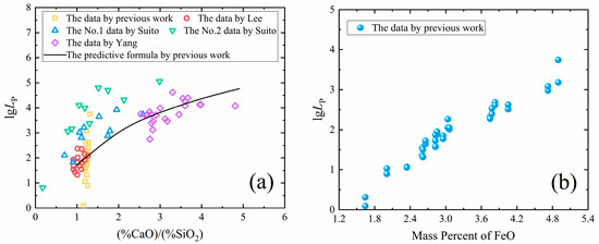 The relationship between lgLP and slag: (a) the basicity (%CaO)/(%SiO2) and (b) the mass percent of FeO [19].