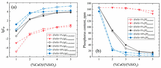 The phosphorus distribution ratio between slag and metal can be expressed as . Basicity and FeO play an important role in dephosphorization. According to previous studies, increasing the basicity and FeO content of slag can improve the phosphorus distribution ratio, as shown in Figure 5 [19].