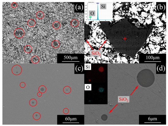 Microscopic image of SiO2 by SEM: (a,b) in the direct reduced iron (DRI) and (c,d) in the primary pure iron.