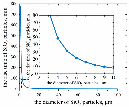 In this study, the viscosity of SiO2 particles is much higher than that of molten iron, so the viscosity of molten iron in the formula can be ignored, and Equation (7) is simplified as Equation (8).