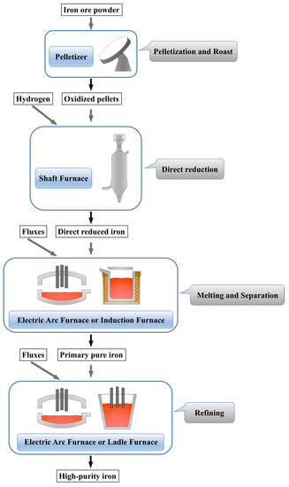 The process of producing high-purity iron is shown in Figure 9. Iron ore fines are transformed into oxidized pellets by a disc pelletizer with pelletizing and roasting functions. The direct reduction step is carried out in a shaft furnace using hydrogen as a reducing agent to produce sponge iron. Although most of the current direct reduction processes use a CO–H2 mixture from natural gas pyrolysis as reducing agent, hydrogen metallurgy without carbon emissions is gradually developing. Some enterprises, such as the HYBRIT project in Sweden, have carried out attempts to use pure hydrogen in metallurgy [26]. Hydrogen metallurgy is the future development direction, with the goal of reducing CO2 emission and developing cleaner industry. The melting process of DRI can be carried out using a mid-frequency induction furnace or an electric arc furnace, and the secondary refining can be carried out in an electric arc furnace or an LF furnace. These devices are conventional metallurgical equipment and have very mature experience in use.