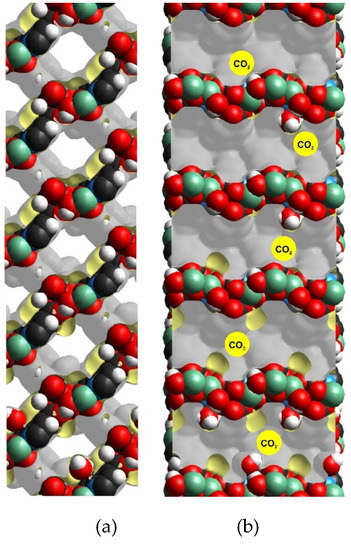 Interestingly, four and two H2O molecules interacting via hydrogen bonding to Mg-CUK-1 (molecules per unit cell) lead to a window reduction of 4.68 and 4.43 Å, respectively (Table 1). However, the minimum distance between two adjacent water molecules is 3.3 and 6.7 Å for Mg-CUK-1 with four and two water molecules, respectively. According to this, the path for the diffusion of CO2 is restrained (Figure 1) and a low CO2 adsorption is expected. Following this trend, an increase in the distance between the water molecules within the pore can result in a favorable space for CO2 to interact with the H2O molecules. When there is one hydrogen-bonded H2O molecule per unit cell, the pore-window is reduced to approximately 4.43 Å and the distance between two water molecules increases to 20.5 Å (Table 1). This can provide enough free space for the CO2 molecules to diffuse within the pore-window and, as we previously reported, a “bottleneck effect’’ occurs [16,17]. This effect is expected to accommodate the CO2 molecules more efficiently, by partially obstructing the pore-windows of Mg-CUK-1. Indeed, this particular configuration (one hydrogen-bonded H2O molecule per unit cell) corresponds to 18% of relative humidity (RH), according to the water adsorption isotherm [12,13]. Remarkably, Mg-CUK-1 revealed a 1.8-fold increase in CO2 capture from 4.6 wt% to 8.5 wt% in the presence of 18% RH [12] (See Figure S11).