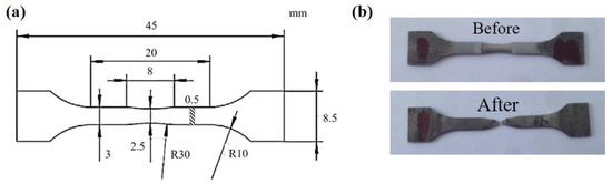 In-situ tensile specimens were machined from the bars via electric discharge machining, and dimensions of the specimens are presented in Figure 1a [15]. The specimens were mechanically ground and then electro-polished in a solution of 6 vol% perchloric acid and 94 vol% acetic acid. In-situ observations were performed in a CS-3400 type SEM (Hitachi, Tokyo, Japan). Tensile tests were performed using a loading stage (maximum load capacity: 1 KN) inside the SEM chamber. The specimen was strained at a strain rate of 0.5 μm/s. The specimens before and after in-situ tensile deformation are shown in Figure 1b.