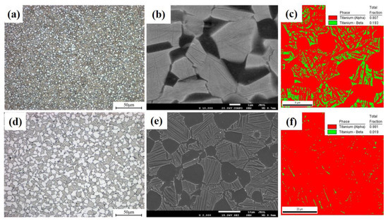 Figure 2 shows the microstructures of the alloy samples. Both the samples exhibited a bimodal structure, which consists of equiaxed αp and lamellar βt. The effect of grain size refinement as related to traces of slow-diffusing β stabilizing elements can be deduced from Figure 2 and Table 2. As β stabilizers, the addition of Mo and W can affect the precipitation process of the secondary α phase (αs) from the β phase. The precipitation of the α phase in the β phase is accompanied by element-diffusion [17]. The diffusion rates of Mo and W in the β phase are much slower than the self-diffusion of β-Ti [18]. The addition of Mo and W could thus enhance the stability of the β phase, and hinder the phase-transformation of the α phase from the β phase, reducing the size of the lamellar αs. As shown in Figure 2c,f, the HBA specimen had 19.3% β phase (marked by green), which is almost 10 times that of the LBA specimen. Therefore, it can be concluded that the greater the content of slow-diffusing β stabilizing elements, the finer the grain size and the greater the content of β phase.