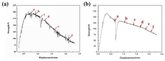 In-situ SEM tensile deformation was adopted to study the deformation and fracture behavior of the present alloys with different slow-diffusing β stabilizing elements, focusing on the microvoid nucleation and propagation process. Figure 3, Figure 4 and Figure 5 show the typical tensile-displacement curves and in-situ SEM images respectively, taken at sequential load levels during 650 °C tensile processes. Each SEM image corresponds to a point on the curve in Figure 3. During the tensile process, in order to collect SEM images, the tensile process was paused and the load was held, which causes stress relaxation. As shown in Figure 3, slight stress relaxation occurs during the pauses. After imaging, it was loaded again.