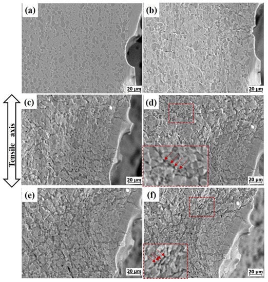 Figure 5 shows the in-situ SEM images of the HBA alloy taken at sequential load levels during the 650 °C tensile process. Before the stress reaches UTS, no defect can be observed on the surface of the specimen (Figure 5a). As the strain increases further, tensile stress decreases, and microvoid nucleation along αp/βt interfaces is observed when the deformation is about 0.9 mm (Figure 5b), the number of microvoids increasing slowly with increasing the strain. The red rectangular fields in Figure 5d,f are locally enlarged in the lower left corner. From this enlarged view, it can be clearly observed that the crack is composed of circular holes as shown by the arrows; with the deformation increasing, the holes become interconnected. Compared with the LBA sample, the number of microvoids in the HBA sample is lower and the microvoids grow into circular holes. When the deformation reaches a certain degree, a series of “hole strings” will be formed on the interface as shown in the enlarged red rectangular region. As the deformation continues, the adjacent “hole strings” merge along the interface and develop into wavy cracks.