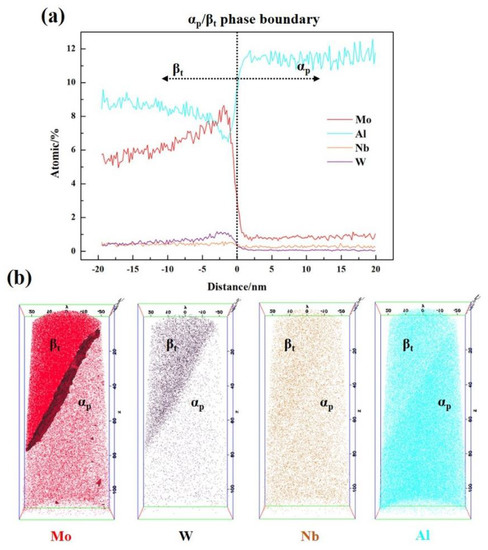 3DAP results from HBA sample: (a) The distribution of Mo, W, Nb and Al in βt and αp; (b) 3DAP maps (40 × 40 × 100 nm) of Mo, W, Nb and Al atoms.