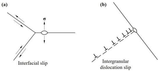 At high temperature, due to the low density of atoms at the interface, the atoms can diffuse easily, and this interfacial slip participates in the deformation process. In order to maintain the continuity of grain boundary, the interfacial slip needs the coordination of the intergranular dislocation slip. Therefore, when the intragranular slip cannot coordinate the interfacial slip, the triple point of the two-dimensional (2d) interface will restrict the interfacial slip, which will cause a large stress-concentration and lead to the formation of microvoids in the interface. Figure 7a is the schematic image of microvoid initiation near the triple point of 2d interface. Riedel [22] proposed the following expression for the stress-distribution at the interface: