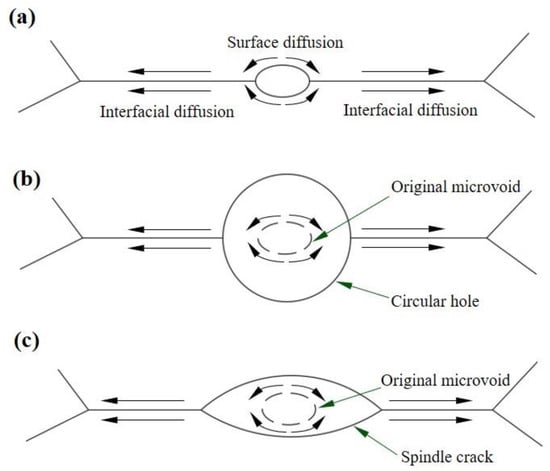 (a) The model of microvoid growing with diffusion; (b) the model of microvoid growing up into a circularshape cavity; (c) the model of microvoid growing up into a spindle shape crack.