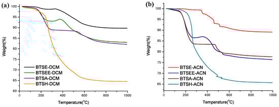 Thermal Gravimetric Analysis (TGA) graphs (in air) of materials from reactions with different cross-linkers in (a) dichloromethane and (b) acetonitrile, note BTSEE shows oxidation of the double bond at 400 °C.