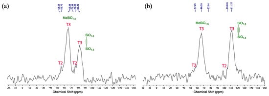 Solid state 29Si nuclear magnetic resonance (NMR) of (a) Me-BTSEE-based network polymer from DCM showing unreacted ethoxy shoulders (T2) at −55 and −76 ppm and main peak for T3 at −65 and −85, respectively, (b) Me-BTSA-based network polymer from DCM showing unreacted ethoxy shoulders (T2) at −67 and −104 ppm and main peak for T3 at −66 and −111, respectively.
