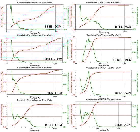 Density functional theory (DFT) method pore size distributions and cumulative pore volume from Brunauer–Emmet–Teller (BET) method measurement for Me-BTSE, Me-BTSEE, Me-BTSA and Me-BTSH in both DCM and ACN.