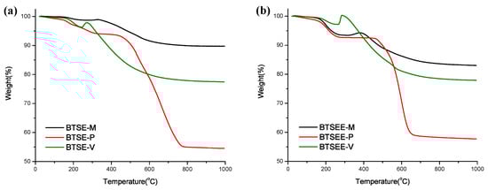 Reactions with cross-linkers BTSEE and BTSA in DCM show precipitation within 1 h of adding catalyst to the reaction, with specific surface area (SSA) trending similarly with values of 556 and 454 m2 g−1. This decline in SSA for BTSEE and BTSA can most likely be attributed to difficulties in the system reaching reaction completion. Incomplete networks contain large amounts of pore-blocking ethoxy/hydroxy groups. This is evidenced by “post-curing” drops in the TGA below 200 °C (Figure 1a). For example, with BTSA and BTSEE, though pore size distribution patterns are similar to reactions with BTSE, they show 10% and 7% drops in this “post-curing” region of the TGA, which result in a loss of ~0.2 cm3/g of cumulative pore volume, equivalent to half the BTSE SSA. In addition, materials with BTSEE in both solvents show oxidation peaks at around 375 °C, this indicates that the ethylene π-bonds remain chemically active for further functionalization [54,55].
