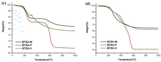 TGA graphs of materials from reactions with three corner-silanes and (a) BTSE, (b) BTSEE, (c) BTSA, (d) BTSH from DCM. BTSE: 1,2-bis(triethoxysilyl)ethane; BTSEE: 1,2-bis(triethoxysilyl)ethylene; BTSA: 1,2-bis(triethoxysilyl)acetylene; BTSH: 1,6-bis(triethoxysilyl)hexane; DCM: dichloromethane; ACN: acetonitrile.