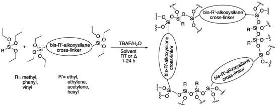 Sol-gel reactions of R- and bis-R-alkoxysilanes have been used over the years to synthesize a wide variety of highly porous materials containing hybrid inorganic/organic moieties [1,2,3,4,5,6]. Although historically these types of porous materials have focused on using bridged alkoxysilanes synthesized by acid or base catalysis in a random structural formation, there are many advances in controlling the reactivity that give more focused pore sizes and overall reaction control [7,8,9,10,11,12,13,14]. There have been a few strategies implemented for this, including extensive processing and templation methodologies to maximize porosity and pore-structure stability [10,12,15,16,17,18,19,20,21]. The advancements and mechanistic understanding of fluoride catalysis (non-stoichiometric) as a technique to synthesize these types of structures has enabled vast improvements in these materials from a structural and synthetic control standpoint [22,23]. For example, Corma et al. have found good synthetic control with fluoride catalysis methods and showing bridging moiety control of porosity [23]. These improvements are due to the rapid equilibration processes that occur, which allow for the facile generation of more uniform porosity in materials as well as controlled swellability [13,15,24,25,26,27,28,29].