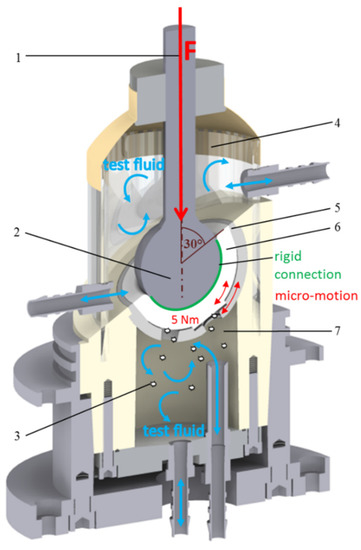 The cup system (Figure 1(5)) was fixed in polyurethane and dynamically loaded with a frequency of 3 Hz and a force of up to 2.5 kN. Simultaneously, a moment of about 5 Nm (Figure 1) was induced in the cup system. The inclination of the cup was 30° to the load axis (Figure 1(1)). The test duration was 2 × 106 cycles.