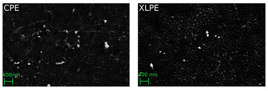The morphology parameters AR and R did not differ significantly between the CPE and XLPE (AR: p = 0.465 and R: p = 0.126). The particles were predominantly characterized by a round morphology. The XLPE tended to have a larger amount of round particles than the CPE. In addition, the XLPE particles were slightly but significantly larger (p = 0.028). The PE backside wear particles were generally nanoparticles in a size range of between 40 and 100 nm (Figure 4).