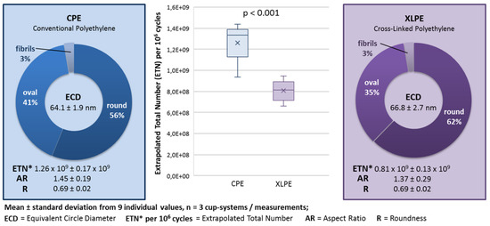 Figure 2 shows an example of isolated backside PE wear particles. Figure 3 shows the mean and standard deviations of the PE backside wear in a direct comparison between the use of CPE and XLPE in the investigated cup system. The results of the CPE backside wear with the parameters ETN, ECD, AR and R were partially published in a previous study [9]. In addition, the amounts of different particle shapes and the median (max and min) are shown in Figure 3.