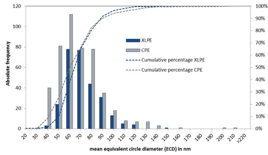 The size distribution of the analyzed particles from the CPE and XLPE inserts.