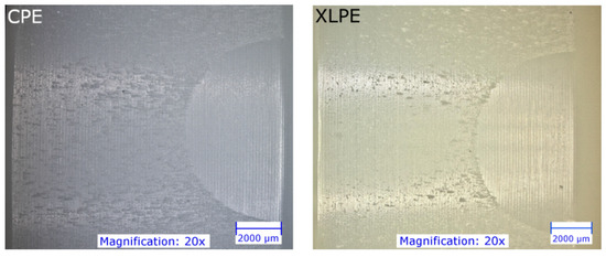 Figure 5 shows an example of the backside of the CPE and XLPE inserts. It seems that micro-scratches are much more pronounced on the CPE inserts than on the XLPE inserts, whereas the XLPE inserts show a higher proportion of pitting. However, the damage to the XLPE inserts is generally less pronounced.